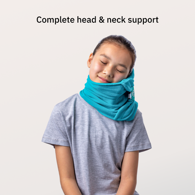 If you are helping your child put on their pillow, start by either sitting or standing in front of them. Position the pillow behind their head, holding the grip in one hand and the scarf in the other, then fasten the hook and loop closure to their preferred level of comfort. Check that it’s not too loose or too tight - it should be snug enough for the support to stay in place, with enough room to relax.